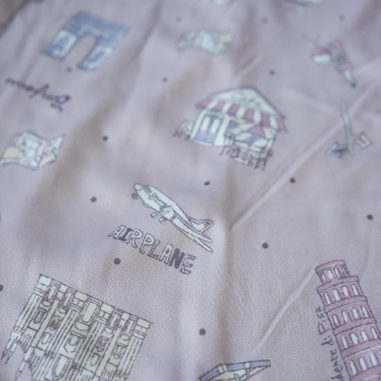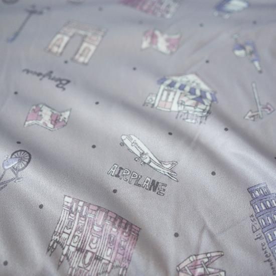 光沢のある生地に、飛行機やエッフェル塔にピサの斜塔他